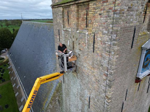 Het werk op hoogte is met behulp van een hoogwerker vakkundig uitgevoerd door de firma Kloksgewijs uit Rosmalen.