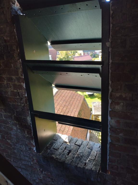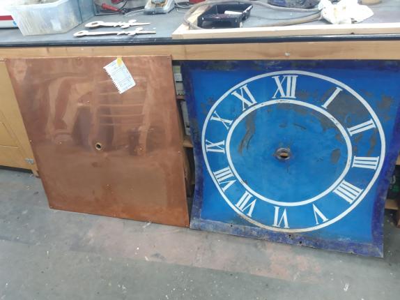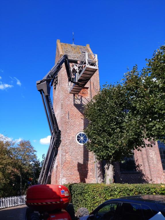 Vanwege de werkzaamheden op hoogte was wel een telescoopkraan nodig. Altijd een noodzakelijke extra kostenpost, maar wel de moeite waard want alle euvels zijn verholpen, het houtwerk glimt en glanst weer en wijzerplaat en wijzers kunnen er weer jaren tegen.