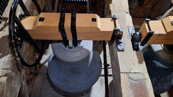 Intussen hangen beide klokken alweer een poosje vredig naast elkaar - aan hun splinternieuwe jukken - en laten zij zich op gezette tijden welluidend boven Burgwerd en omstreken horen.