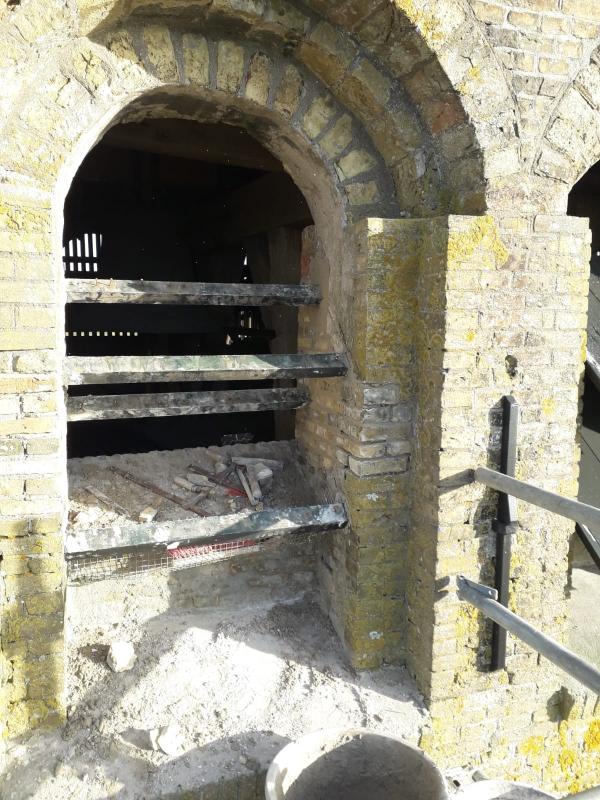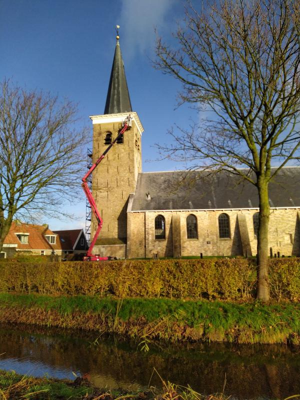 Hak- en breekwerk aan de toren Om de klok naar binnen te kunnen takelen moesten de galmborden worden verwijderd en moest het luidgat tijdelijk 'ruimer' gemaakt worden zodat de firma Vellema uit Hallum de klokken met een telescoopkraan veilig naar binnen kon takelen. Metselaar Bram Bus nam het hak- en breekwerk voor zijn rekening en herstelde na het inhangen van de klokken de schade. Hij maakte onderstaande foto. En tot slot zijn het galmbord, de geprofileerde lijst tussen toren en spits en de dakgoot door schildersbedrijf De Noordhoek uit Leeuwarden van een nieuwe verflaag voorzien.