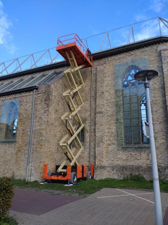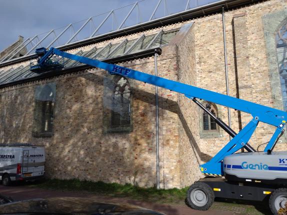 Op gezette tijden is daarom een hoogwerker in of bij de kerk te zien. Zo ook begin november toen Terpstra Daktechniek uit Sneek dit keer met twee verschillende hoogwerkers het weer eens lekkende kitwerk herstelde.